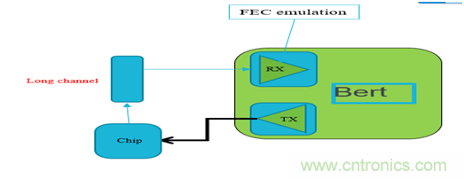 客戶的芯片的接收端可以支持FEC的糾錯功能,但要測試在不同的channel條件和不同的發(fā)送端均衡的設(shè)定下,芯片經(jīng)過FEC后的誤碼率能降低到多少,如果將信號直接環(huán)回到芯片的輸入端的話,需要不停的修改芯片的FEC的參數(shù)來進(jìn)行測試,但由于其芯片每修改一次FEC的參數(shù)如FEC的symbol size, block size,content size等等都需要重新對芯片進(jìn)行代碼編譯和下載,每次下載需要幾分鐘的時間,由于不同的條件都要測試,則組合數(shù)量很多,導(dǎo)致測試效率非常低。