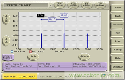 由于客戶的系統(tǒng)要進(jìn)行長時間的(-20到+80度下)的高低溫老化測試,客戶要看誤碼的性能和溫度變化的相關(guān)性,一般的誤碼儀只能統(tǒng)計溫度變化過程中誤碼的總的個數(shù)和誤碼率,而無法得知在整個十幾個小時里面任一時刻誤碼率的變化。而BSX系列誤碼儀則可以使用Strip chart的記錄功能將整個過程中記錄下來,后面可以根據(jù)需要查詢?nèi)我鈺r刻的誤碼率變化情況。如下圖,在第10/20/30秒的時間點出現(xiàn)了一些突發(fā)的誤碼,這個如果僅僅是通過簡單的誤碼統(tǒng)計是無法看到時間相關(guān)的細(xì)節(jié)的,而且其累積記錄時間可以長達(dá)幾十小時甚至幾天。