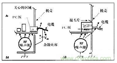 即使工程師采取許多上述所列的預防措施,來減小在I/O區內的RF噪聲,還不能保證這些預防措施能否成功地足夠滿足發射要求。有些噪聲是傳導干擾,即在內部電路板上按共模電流流動。這個干擾源是在底板和電路等之間。于是,這個RF電流一定通過最低阻抗(在底板和載信號線之間)的通路流動。如果連接器沒呈現足夠低的阻抗(與底板的搭接處),這RF電流經雜散電容流動。當這RF電流流過電纜時,不可避免地產生發射(圖1A)。