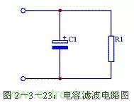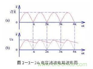 (1)電容濾波電路電容濾波電路圖見圖2-3-23,電容濾波電路是利用電容的充放電原理達到濾波的作用。在脈動直流波形的上升段,電容C1充電,由于充電時間常數很小,所以充電速度很快;在脈動直流波形的下降段,電容C1放電,由于放電時間常數很大,所以放電速度很慢。在C1還沒有完全放電時再次開始進行充電。這樣通過電容C1的反復充放電實現了濾波作用。濾波電容C1兩端的電壓波形見圖2-3-24(b)。