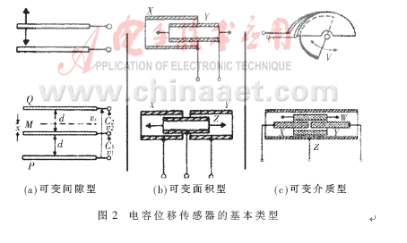 電容位移傳感器的三種基本類型如圖2所示。其具體結構可視實際運用的場合靈活多變,電容極板可以是平面的或者球面的;運動電極可以采用水銀等導電液體。圖2所示的三種基本類型均可組成差動式結構,如各分類中下部圖形所示。采用差動式結構能夠提高傳感器線路的輸出靈敏度,減小非線性,還能在一定程度上抑制由靜電吸引帶來的誤差。當要求測量系統具有很高的分辨力時,一般是保持極板面積相對固定而使電容傳感器極板間隙隨被測位移改變,即如圖2(a)所示的結構。反之,采用保持間隙恒定而讓極板相對面積可變的結構,則可以在相當大的動態范圍內獲得線性的響應[1]。