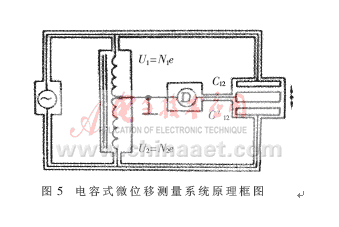 現以設計一個測量微小位移的系統為例來說明上述測量方法的應用。首先,用高導磁率環形鐵芯繞制出感應耦合比率臂,再設計適當的可變間距三電極差動式電容位移傳感器的結構,并采用比率測量線路,就有如圖5所示的微位移測量系統原理框圖。對雙極板電容傳感器,不考慮電場的邊緣效應,兩個直接電容為:C12=