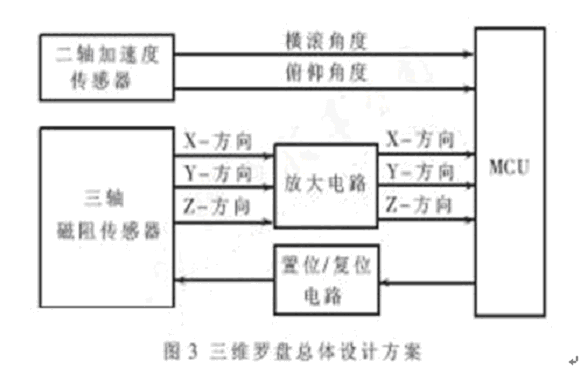 本電子羅盤的設計充分考慮了汽車內部的不平穩性以及磁場干擾,采用了抗干擾技術,使系統測量精度得到了提高。由于采用了三軸設計和姿態補償設計方案,使羅盤處于任何姿態時均能正常使用。此外,本系統經過微控制器進行數字輸出,從而可集成于GPS定位系統之中。