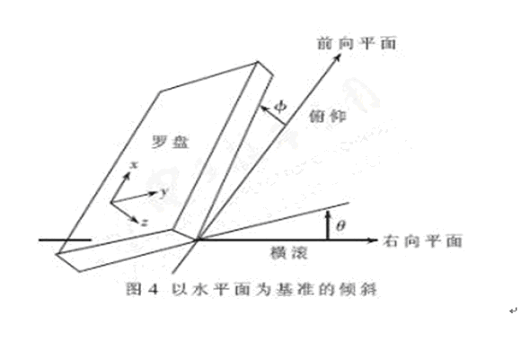 地球磁場的強度為0.6高斯左右,現有的磁阻傳感器可以很好地測量地磁場范圍內的磁場強度。由于二維羅盤只能在保持水平的情況下正常工作,如果用于車輛的動態環境中,將不可能保證其永遠水平,所以在這種場合下,羅盤的可使用性大大降低。于是需要設計三維羅盤以適應各種姿態的測量。三維電子羅盤的總體設計方案如圖3所示。三軸磁阻傳感器分別從X、Y、Z 三個磁場強度方向輸出電壓,經過放大電路分別輸入到三個具有A/D轉換能力的MCU端口,二軸加速度傳感器測量俯仰角度和橫滾角度,測量參數的意義如圖4所示。