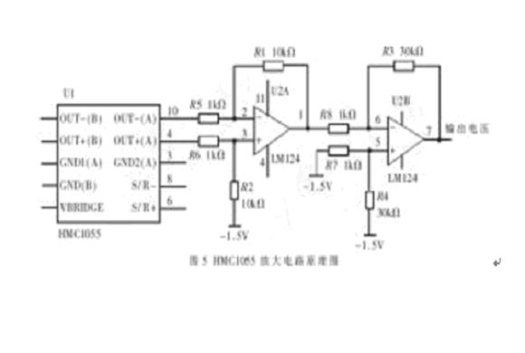 各向異性磁阻(AMR)傳感器由惠斯頓電橋進行工作,并且傳感器輸出電壓很小,需要放大才能進行A/D轉換。下面以HMC1052為例進行分析。HMC1052的靈敏度為±1.0mV/V/高斯,電橋偏置電壓值為±1mV/V。在橋路電壓3V和625毫高斯最大的磁場強度下,橋路偏置電壓為:
