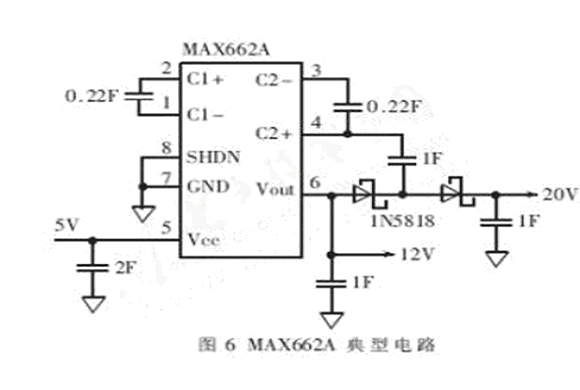 在HMC1055芯片上,置位/復位片的引腳名稱是S/R+和S/R-,沒有極性的區別,單個置位/復位帶標準阻值為2.0Ω,所以對于三軸系統,三個金屬片串聯阻值為6.0Ω,則產生一個3~4A的最小脈沖驅動一個6Ω的負載所需的供電電壓為18V~24V。由于系統芯片都是使用5V電源,所以需要將5V電壓升壓到20V左右,可以使用MAX662來完成。典型的電路如圖6所示。