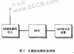 本文設計了一種直接式TPMS,其原理如圖1所示。該系統由兩部分組成,輪胎模塊和車載接收模塊。其中,輪胎模塊包括壓力和溫度傳感器、A/D變換器、控制器及射頻發射器等,如圖2所示。車載接收模塊包括了射頻接收器、控制器以及顯示報警裝置等,如圖3所示。