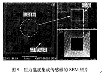 圖5是本文制作的傳感器芯片的電鏡照片。圖5(a)為器件正面全貌;圖5(b)為薄膜正面;圖5(c)為薄膜背面。其中壓敏元件采用比常規更厚的50μm硅杯薄膜(500 μm×500μm),增大了體硅上高應力區的面積,在降低工藝要求的同時提高了線性測量范圍和過載壓力。壓敏電阻設計為折線結構,采用優化的幾何尺寸,并將其部分制作在高應力體硅上以獲得更高靈敏度。體硅上的溫敏電阻隨壓敏電阻利用同步注入工藝制作,減小了工藝復雜度。該器件工藝簡單,成品率高,與標準IC工藝兼容。