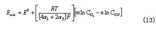 在COCO濃度對數呈線性關系。2一定的條件下,Emix也與如果在氧氣的電化學反應為電荷傳輸過程控制,且過電位較大,而CO的氧化反應由擴散極限控制,那么聯立等式(4)、(6)、(9)和(11),得到平衡混合電勢為: