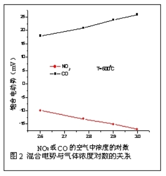 當多個電化學反應在電極上發生時,平衡電勢就是混合電勢,它來自于電極上各個反應的競爭。采用具有不同催化作用的電極材料的固態混合電勢電化學傳感器在不同的電極上產生不同的平衡電勢。對于低濃度的分析氣體,可能的控制過程有質量傳輸過程和電荷傳輸過程,而分壓比較高的氧氣的控制過程主要是電荷傳輸過程,這些過程就決定了混合電勢傳感器的各種響應模式。