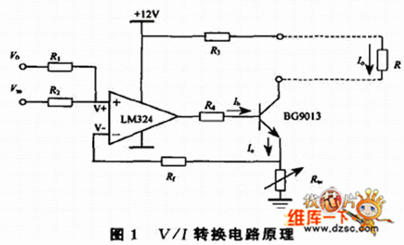電壓/電流轉(zhuǎn)換即V/I轉(zhuǎn)換,是將輸入的電壓信號轉(zhuǎn)換成滿足一定關(guān)系的電流信號,轉(zhuǎn)換后的電流相當(dāng)一個輸出可調(diào)的恒流源,其輸出電流應(yīng)能夠保持穩(wěn)定而不會隨負(fù)載的變化而變化。V/I轉(zhuǎn)換原理如圖1。