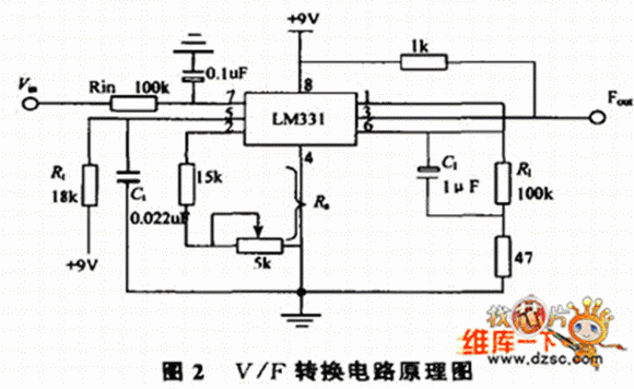 由Fout= Vin•Rs/(2.09•R1•Rt•Ct)可知,電阻Rs、R1、Rt和電容Ct直接影響轉(zhuǎn)換結(jié)果Fout,因此對元件的精度要有一定的要求,可根據(jù)轉(zhuǎn)換精度適當(dāng)選擇,其中Rt、Ct、Rs、R1要選用低溫漂的穩(wěn)定元件,Cin可根據(jù)需要選擇0.1uF 或1uF 。電容C1對轉(zhuǎn)換結(jié)果雖然沒有直接的影響,但應(yīng)選擇漏電流小的電容器。電阻R1和電容C1組成低通濾波器,可減少輸入電壓中的干擾脈沖,有利于提高轉(zhuǎn)換精度。電路中的47Ω 電阻對確保電路線性失真度小于0.03% 是十分必須的。