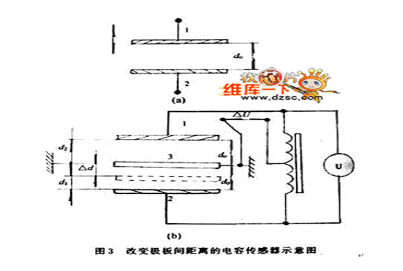 圖3是這類傳感器的原理圖,圖3(a)由2塊極板構成,其中極板2為固定極板,極板1為與被測物體相連的活動極板,可上下移動。當極板間的遮蓋面積為S,極板間介質的介電常數為ε,初始極板間距為d0時,則初始電容C0為: