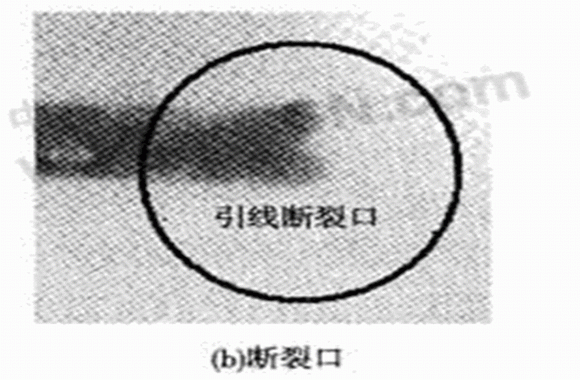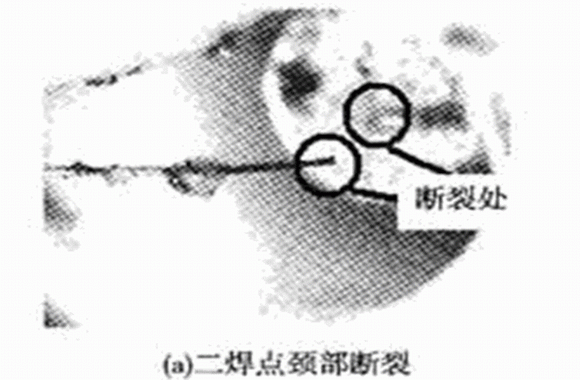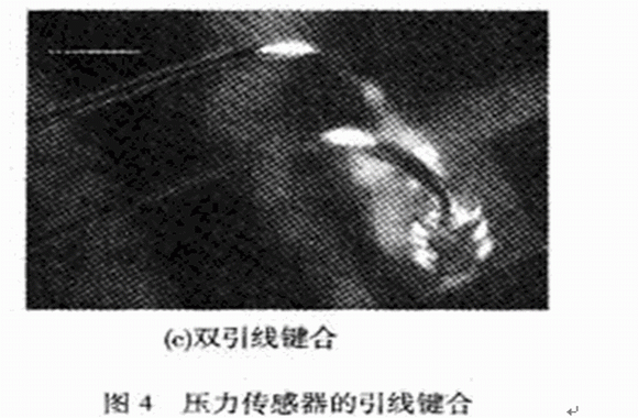 用于引線鍵合的鍵合線有Al線和Au線,由于Au線性能更優(yōu),所以壓力傳感器的鍵合工藝選用Au線。鍵合時要使鍵合面保持清沽,否則會影響鍵合強度,等離子清洗是一種能有效提高鍵合強度的方法。由于機油壓力傳感器工作環(huán)境惡劣,尤其是頻繁的振動會導(dǎo)致金絲有缺陷的地方疲勞斷裂,或者最容易疲勞的位置如第二焊點附近的頸部位置發(fā)生斷裂,因此要求更高的鍵合質(zhì)量。曾對所研制的機油壓力傳感器進行了臺架試驗,在一批試驗樣品中經(jīng)過6×105次加壓和卸壓試驗之后,發(fā)現(xiàn)有兩個樣品失效,故障分析結(jié)果表明:一個樣品的失效模式為信號處理電路上的一個電阻損壞;另一個樣品的失效模式為金絲線斷裂,如圖4(a),(b)所示。對于這種情況,可以采用雙金絲鍵合工藝,并盡量選用高純度、低缺陷的金絲,并做好引線鍵合前各封裝器件的清潔工作,如圖4(c)所示。這樣對金絲鍵合工藝進行改進后,在可靠性試驗中,未曾出現(xiàn)金絲斷裂的質(zhì)量問題。