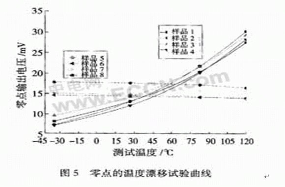 由于芯片對所處環(huán)境的要求比較特殊,所以與硅芯片接觸的硅油需要具備以下特點:良好的介電性能、盡可能小的熱脹系數(shù)、化學(xué)穩(wěn)定性好以及耐熱和耐寒性能好。硅油的凈化處理是薄膜隔離式壓力傳感器封裝中至關(guān)重要的工藝步驟,因為若凈化不干凈,硅油或傳感器受壓部分的充油腔內(nèi)就會混有氣體、水分等可壓縮、易揮發(fā)的物質(zhì),在全溫區(qū)內(nèi)的體積變化就會沒有規(guī)律可言,造成外界的待測壓力不能準(zhǔn)確、規(guī)則地傳遞到芯片,從而使得壓力傳感器的溫漂比較嚴(yán)重。這種現(xiàn)象反映在零點的溫漂上,可以用來評價封裝的好壞。通常,由于在恒壓源激勵的情況下壓力傳感器的靈敏度溫度系數(shù)為負值,所以壓力傳感器的零點稍有下降,如圖5的樣品5,6,7,8所示;而硅油凈化不充分的壓力傳感器零點的溫漂卻非常大,且隨著溫度的升高而升高,如圖5中的樣品1,2,3,4所示。試驗表明,像樣品1,2,3,4這類溫漂很大的傳感器的溫度補償是比較困難的,所以封裝時必須確保硅油品質(zhì)和填充量恰到好處。