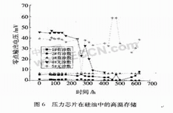 1#,2#,3#涂敷了保護層,4#,5#沒有涂敷保護層。可以看到,沒有保護層的傳感器在高溫下存儲了約200 h后,它的零點突然發(fā)生了變化,之后數(shù)據(jù)不穩(wěn)定;涂了保護層的壓力傳感器的零點在600多小時后仍然很穩(wěn)定。因此,為了防止硅油的污染導(dǎo)致壓力傳感器的失效,我們采取了一些必要的措施。首先,選擇高溫下盡可能穩(wěn)定的硅油;其次,盡量選擇具有良好鈍化層的芯片;最后,在不影響靈敏度的前提下,還可以在封裝過程中對芯片以及引線進行涂敷鈍化層的處理。