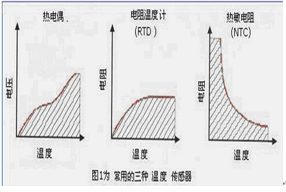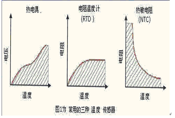 溫度是測量頻度最高的物理參數,并且可采用各種各樣的傳感器來進行測量。所有這些傳感器均通過檢測某種物理特性的變化來推斷溫度。最常用的三種溫度傳感器是熱電偶、電阻溫度計(rtd)和ntc熱敏電阻,見圖1所示。值此先作介紹。