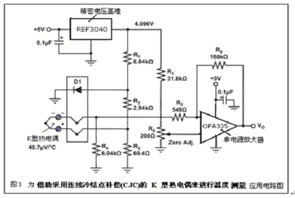 圖4為該應用電路圖。該熱電偶測量電路采用自動置零、單電源放大器opa335。精密電壓基準ref3040提供4.096v的橋式電源。二極管d1的正向電壓具有-2mv/℃的負溫度系數,并通過電阻器網絡r1-r3來提供冷結點補償。