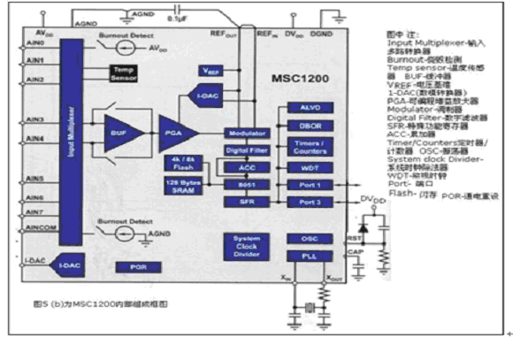 mscl200集成了具有22位有效分辨率的△∑型adc、通用型輸入多路轉換器、可選輸入緩沖器和增益調節范圍為1-128的可編程增益放大器(pga) ,見圖5(b)所示。該器件包括片上溫度傳感器、快閃存儲器和sram存儲器以及改良型8051-cpu(在功耗相同的情況下,其運行速度可達最初標準版本的3倍)。片上電流數字-模擬轉換器(1-dac)可提供至rtd和熱敏電阻的激勵電流。其mscl200混合信號控制器內部框圖見圖5(b)所示。