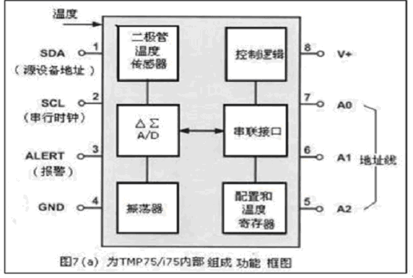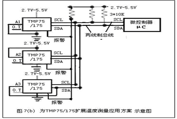 tmp75 和tmpl75是二線式、串行輸出溫度傳感器,其內部組成框圖見圖7(a)所示。這些器件無需使用外部元件,并能夠以0.0625℃的分辨率來顯示溫度讀數。二線式接口與smbus兼容,從而允許tmpl75在一根總線上連接多達27部設備(而tmp75則最多可在一根總線上連接8部設備)。這兩款器件均具有smbus報警功能,是工業環境中常見的擴展溫度測量應用(見圖7(b)所示)的理想選擇。