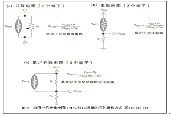 *熱敏電阻rntc與tc647b連接的三種方案。見圖9(a)(b)(c)所示