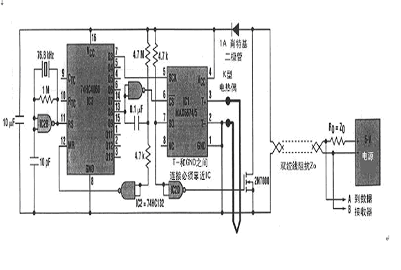 由于EMI與線長度成正比,所以使噪聲最小的通常選擇是把控制電路靠近感測點(diǎn),增加1個靠近感測點(diǎn)的遠(yuǎn)程板或采用復(fù)雜的信號濾波和纜線屏蔽。1個比較妙的方案是在靠近感測點(diǎn)數(shù)字化熱電偶輸出(圖1).