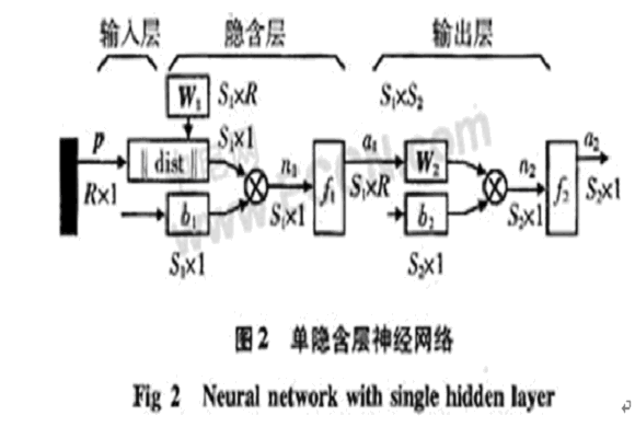 其中,p為輸入矢量,R為輸入矢量維數(shù),S1為隱含層神經(jīng)元個數(shù),S2為輸出層神經(jīng)元個數(shù),W1為隱含層神經(jīng)元權(quán)值矩陣,W2為輸出層權(quán)值矩陣,b1為隱含層神經(jīng)元閥值,b2為隱含層神經(jīng)元閥值,n1為隱含層輸入節(jié)點,n2為輸出層節(jié)點。f1為S型函數(shù),f2為purelin型函數(shù)。神經(jīng)網(wǎng)絡算法是用于前饋多層網(wǎng)絡的學習算法。如果輸出不能得到期望的輸出,則轉(zhuǎn)入后向傳播。通過誤差的后向傳播調(diào)整各層之間的權(quán)系數(shù)。反復輸入樣本序列,直至權(quán)系數(shù)不在改變?yōu)橹梗敵稣`差在規(guī)定的范圍之內(nèi)。算法采用如下改進:1)采用模擬退火法以克服局部最小;2)用奇函數(shù)作激勵函數(shù)和傳播過程中采用新誤差傳播因子完善該算法收斂性問題。