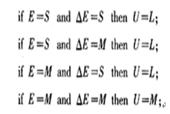 基于神經(jīng)網(wǎng)絡在推理方面不足,故借助于模糊控制強大的推理功能,提取有效的條件語句,進而加快網(wǎng)絡的訓練速度。選取偏差E和偏差變化率△E作為輸入和控制量U作為輸出。偏差E和偏差變化率△E的模糊量分別為大(L),中(M),小(S),創(chuàng)立描述條件推理表格如表1。