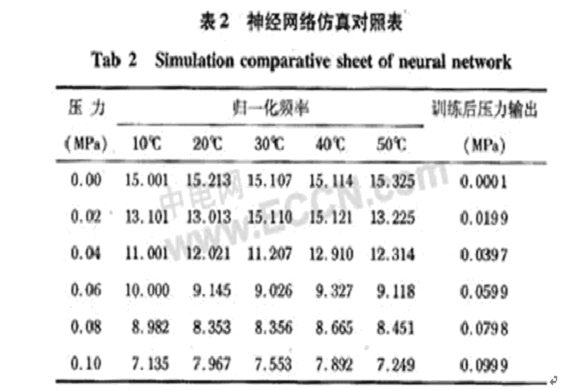 境下進行神經(jīng)網(wǎng)絡的訓練和仿真,通過神經(jīng)網(wǎng)絡工具箱,編制相應的仿真訓練程序,實現(xiàn)仿真過程。在仿真時,隨機選取幾組頻率-溫度作為輸入,最后,進行標定壓力值和仿真結(jié)果的比較。仿真數(shù)據(jù)結(jié)果如表2。