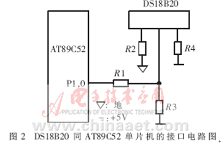 DS18B20的測溫原理為:內(nèi)部計數(shù)器對一個受溫度影響的振蕩器的脈沖計數(shù),低溫時振蕩器的脈沖可以通過門電路,而當(dāng)?shù)竭_(dá)某一設(shè)置高溫時,振蕩器的脈沖無法通過門電路。計數(shù)器設(shè)置為-55℃時的值,如果計數(shù)器到達(dá)0之前門電路未關(guān)閉,則溫度寄存器的值將增加,這表示當(dāng)前溫度高于-55℃。同時,計數(shù)器復(fù)位在當(dāng)前溫度值上,電路對振蕩器的溫度系數(shù)進(jìn)行補償,計數(shù)器重新開始計數(shù)直到回零。如果門電路仍然未關(guān)閉,則重復(fù)以上過程。溫度轉(zhuǎn)換所需時間不超過750ms,得到的溫度值的位數(shù)因分辨率不同而不同[2]。DS18B20同AT89C52單片機的接口電路如圖2所示。這種接口方式只需占用單片機一根口線,與智能儀器或智能測控系統(tǒng)中的其它單片機或DSP的接口也可采用類似的方式。