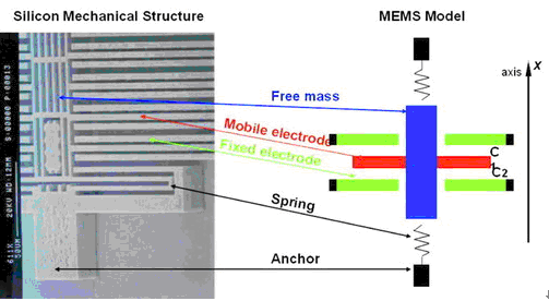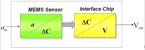 在電容式的結(jié)構(gòu)中,當(dāng)其中的質(zhì)塊出現(xiàn)加速度運動時,就會產(chǎn)生電容量的差異變化(DC),此變化會傳送給另一顆接口芯片(Interface chip),由它來輸出可量測的電壓值。因此,一個3軸加速度計芯片中必須包含兩大單元,一是單純的機(jī)械性MEMS傳感器,它包含測量XY軸的區(qū)域及測量Z軸的區(qū)域,內(nèi)部有成群移動的電子;另一則是標(biāo)準(zhǔn)的ASIC接口芯片,它會將電容變化轉(zhuǎn)換為電壓訊號輸出。