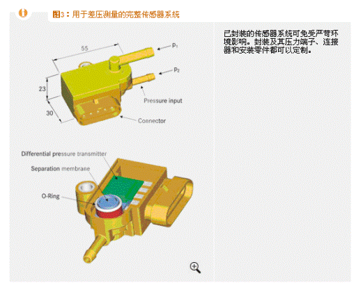 如果將壓力變送器用作獨(dú)立測量系統(tǒng),必須保護(hù)其免受外部環(huán)境影響,如在其結(jié)合處附件的灰塵和水霧。這一點(diǎn)是通過使用在大多數(shù)應(yīng)用中都具有良好的媒介抵抗性和充分的溫度穩(wěn)定性的塑料封裝實(shí)現(xiàn)的。該封裝及其壓力端子、連接器和安裝零件都適合客戶定制(圖3)。對于要求極高的應(yīng)用,還可以提供不銹鋼封裝版本。應(yīng)用包括測量差壓、監(jiān)測腐蝕性氣體濾波器和測量冷卻劑壓力。