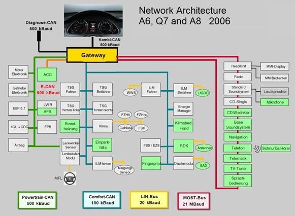 圖2:在現(xiàn)代車輛中,常常需要10到20條不同的數(shù)據(jù)總線將不同的裝配連接到一起。