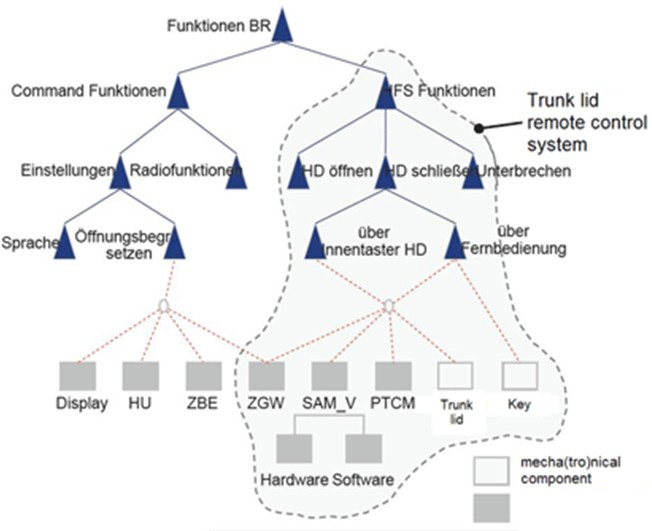 圖3是一個后備箱蓋的工作功能樹。在這里,打開后備箱實際上需要激活兩個ECU裝置。其余的ECU用來執(zhí)行顯示和控制等功能。