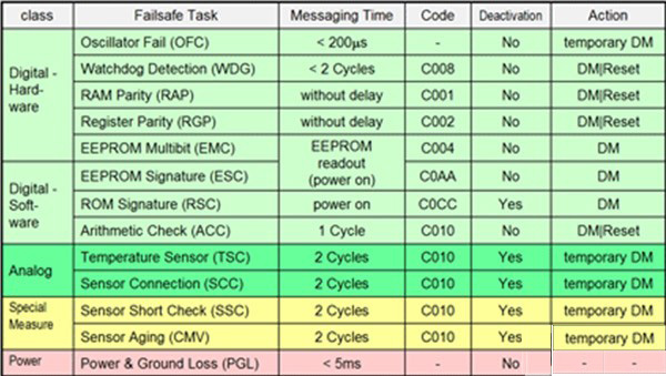 ZMD31150中的臨時DM是一個可選項,在錯誤持續(xù)出現(xiàn)時提供可靠的錯誤信息。利用附加信息(如冗余傳感器或進行大量檢查),ECU將決定當前應用能否繼續(xù)可靠工作,或者根據(jù)錯誤消息必須關斷。