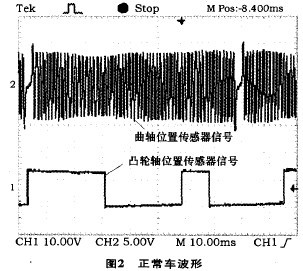 故障分析與測試采用雙蹤示波器同時(shí)測量故障車上曲軸位置傳感器與凸輪軸位置傳感器的波形如圖1所示,在同類型的正常車上測得的凸輪軸位置傳感器和曲軸位置傳感器波形如圖2所示。