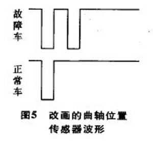 故障總結(jié)為什么此車會出現(xiàn)間歇性起動困難的現(xiàn)象?再來看一下圖1與圖2中曲軸位置傳感器的波形,假如在圖1中曲軸位置傳感器波形最上方向下一點(diǎn)的位置畫一橫線,又在圖2中曲軸位置傳感器波形上同樣位置畫一橫線,根據(jù)在此線上有無波形可得出圖5中的2個(gè)波形,ECU只有得到圖5下圖波形才能發(fā)出點(diǎn)火信號起動發(fā)動機(jī),而ECU得到圖5上的波形不能發(fā)出點(diǎn)火信號起動發(fā)動機(jī),但在偶然的時(shí)刻故障位置產(chǎn)生的波形恰好達(dá)到合格的底線時(shí),就可以起動發(fā)動機(jī)。起動后,ECU對曲軸位置傳感器波形的檢測就不是那么嚴(yán)了,因此,發(fā)動機(jī)起動后不會熄火。也就是此車故障的根本原因。