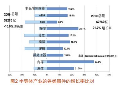 Gartner公司調(diào)查總監(jiān)Stephan Ohr從宏觀(guān)上分析了MEMS的增長(zhǎng)態(tài)勢(shì)。Gartner把MEMS分為光學(xué)和非光學(xué)兩大類(lèi)。光學(xué)MEMS如TI公司的DLP(數(shù)字投影芯片)。非光學(xué)MEMS傳感器年增長(zhǎng)率16.2%(圖2),2010年市場(chǎng)容量會(huì)突破30億美元,有望達(dá)到31億美元;2009年為28億美元。其中,汽車(chē)應(yīng)用仍然保持非光學(xué)傳感器的第一位,占2009年總應(yīng)用中的60%以上;但是數(shù)據(jù)處理和通信應(yīng)用增長(zhǎng)最快,數(shù)據(jù)處理包括硬盤(pán)的G-Force(重力)傳感器,通信中包括手機(jī)的可旋轉(zhuǎn)(rational)的傳感和基于位置的服務(wù)。