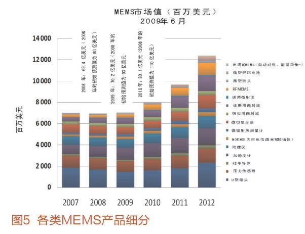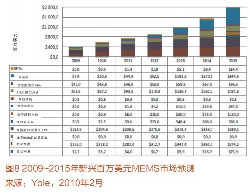 Yolo給出了MEMS的新興和衰落圖(圖7),以及2009-2015年間新興百萬(wàn)美元價(jià)值MEMS預(yù)測(cè)(圖9)。