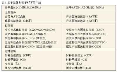 在有線與無線市場迅猛增長的推動下,石英晶體及其高頻版SAW器件正廣泛用于各個領(lǐng)域,小到電子玩具中簡單的無源石英晶體,大到用于最先進的電信網(wǎng)絡(luò)骨干網(wǎng)定時的復(fù)雜同步定時模塊(STM),如表1所示。
