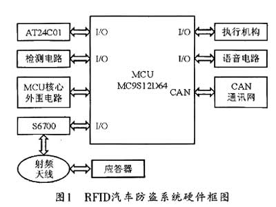 本RFID汽車(chē)防盜系統(tǒng)以RFID系統(tǒng)為核心組成。汽車(chē)防盜系統(tǒng)硬件控制單元選用Motorola(Freescale)的16位單片機(jī)MC9S12D64,射頻識(shí)別系統(tǒng)由閱讀器S6700、應(yīng)答器TAG-IT和射頻天線組成。此外,系統(tǒng)還包括存儲(chǔ)電路(AT24C01),檢測(cè)電路,語(yǔ)音電路和CAN總線通訊電路。RFID汽車(chē)防盜系統(tǒng)的硬件設(shè)計(jì)框圖如圖1所示。
