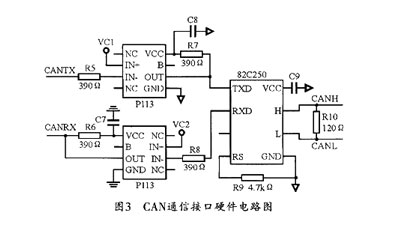 CAN通訊網(wǎng)絡(luò)模塊負(fù)責(zé)將啟動(dòng)信號(hào)和檢測(cè)信號(hào)通過(guò)CAN網(wǎng)傳輸給汽車(chē)的中央處理器。中央處理器通過(guò)接收的信號(hào)做決策判斷。CAN總線通信方式靈活、抗干擾能力強(qiáng),目前在汽車(chē)控制系統(tǒng)中應(yīng)用廣泛。CAN通訊接口硬件設(shè)計(jì)如圖3所示,其中82C250是CAN控制器和物理總線間的接口,它和CAN控制器之間采用光隔P113來(lái)提高系統(tǒng)的抗干擾能力。