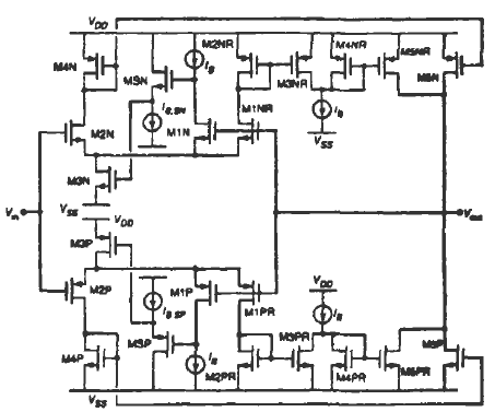 因此,這種緩沖器的工作過程可以這樣詳細描述如下:當輸入信號Vin,在中部電源電壓區,兩個輸入對MIP~M2P和MlN—M2N是有效的,M4P-M5P和M4N--M5N鏡像一個等于IB的電流到輸出支路。而且,電流IB的復制品通過晶體管MIPR(M1NR)和M2PR—M3PR(MlNR—M2NR)拷貝,給輸出支路底部的附加電路的電流源提供電流。因此,晶體管M4P和M5P(M4N和M5N)關斷,而且對輸出電流沒有任何貢獻。輸入信號接近VDD時,PMOS輸入對關斷,而且反相輸入支路的復制品等等都關斷。MIPR--M3PR不對輸出支路的附加電路發送任何電流。這樣的話,M4PR和M5PR導通,從輸出支路吸收等于IB的電流,維持緩沖器是導通的。當輸入信號Vin接近VSS時,類似的情況也會發生。