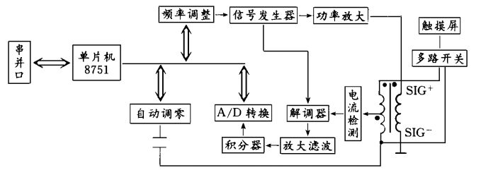 加到觸摸屏的右邊電極上,觸摸屏的上邊和下邊電極全部開路,這樣在觸摸屏的X 方向上建立了交流電壓梯度,經解調器解調和濾波后,可得到X 方向上的觸摸電流為iX= KXXV/ Zf ,其中,V為變壓器次級對于中心抽頭虛地的電壓,KX 為常量,V/ Zf 為電路等價阻抗觸摸電流。第2 種模式為將SIG+加到觸摸屏的左邊電極上,同時也加到觸摸屏的右邊電極上,這時在X 方向上建立了均勻的交流電壓。如果在觸摸屏上任意一點進行觸摸,則經解調器解調和濾波后,得到其觸摸電流為i ZX= KZXV/ Zf ,其中,KZX為常量。由iX 和iZX得X 方向的觸摸位置坐標為X= (KZX/ KX)·( iX/ i ZX ) ,式中,iX、iZX在以上2 種掃描模式下測得,而常量KZX/ KX 可由實驗確定。一旦確定了KZX / KX,就可計算出X 方向的任意觸摸位置坐標X。同樣,第3 種模式是將SIG+和SIG-分別加到觸摸屏的上邊電極和下邊電極上,即可得到Y方向上的觸摸電流為i Y= KYYV/ Zf ,其中,KY 為常量。第4種模式是同時將SIG+加到觸摸屏的上邊電極和下邊電極上,得等價阻抗觸摸電流為 iZY= KZYV/ Zf ,其中,KZY為常量。也可由 iY 和 iZY得Y 方向的觸摸位置坐標為 Y=(KZY/ KY) ( i Y/ i ZX) ,其中,常量KZY/ KY 同樣可由實驗確定。