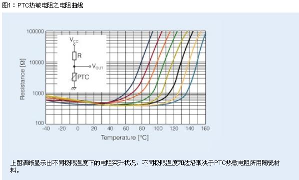 在常溫下,PTC傳感器電阻較低,典型值小于1 k?。然而,隨著溫度的上升,其電阻開始升高。當達到指定極限溫度Tsense時,電阻值為4.7 k?(精確度:±5℃)。如果溫度再上升15 K,PTC電阻將提高10倍,達到47 k?(隨溫升呈指數式躍升)。電阻突升使PTC熱敏電阻成為極限溫度傳感器的理想選擇,允許其在適當時機檢測敏感電子元件的臨界溫度。為此,溫度傳感器應盡量靠近需保護的元件進行安裝,從而確保良好的熱接觸和快速響應時間。