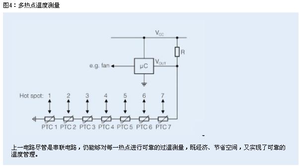 [page]PTC傳感器電阻隨溫度而發(fā)生的陡峭而迅速的變化允許單一簡易電路監(jiān)測多個熱點。舉例來說,如果需要同時監(jiān)測電路板上或設備中的7個不同熱點,可以選擇圖 4所示電路,在每個待測熱點處放置一個PTC。憑借其陡峭特性,所有PTC可實行串聯,仍能確保對每一處熱點進行可靠監(jiān)測。