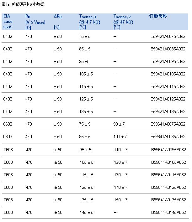 除了配置簡單可靠,該電路還有另一顯著優(yōu)勢:由于超級系列PTC傳感器在75 ~ 145℃范圍均有極限溫度差別是10 K的型號,因此可針對性地使用不同參考溫度監(jiān)測各熱點。表1所述為超級系列產品主要數據。