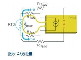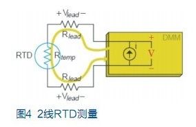 與熱敏電阻相似,鉑電阻溫度傳感器(RTD)也是用鉑制成的熱敏感電阻。當通過測量電壓計算RTD 溫度時,數字萬用表用已知電流源測量該電流源所產生的電壓。這一電壓為兩條引線(Vlead)上的壓降加RTD上的電壓(Vtemp)。例如,常用RTD 的電阻為100Ω,每1℃僅產生0.385Ω的電阻變化。如果每條引線有10Ω電阻,就將造成26℃的測量誤差,這是不可接受的。所以應對RTD作4線歐姆測量。