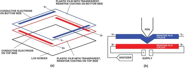 連接直流電壓的層稱(chēng)為“有源”層,電流與其阻抗成反比。測(cè)量電壓的層稱(chēng)為“無(wú)源”層,無(wú)相關(guān)電流流經(jīng)該層。發(fā)生單點(diǎn)觸摸時(shí),在有源層中形成一個(gè)分壓器,無(wú)源層電壓測(cè)量通過(guò)一個(gè)模數(shù)轉(zhuǎn)換器讀取與觸摸點(diǎn)和負(fù)電極之間的距離成比例的電壓1.