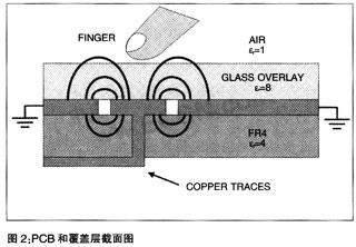 當把手指放在邊緣電場的附近時,電容式傳感系統的導電表面積會增加。由手指所產生的額外電荷存儲容量,就是我們所知的手指電容CF。在本文中,無手指觸摸時的傳感器電容用CP來表示,意指寄生電容。
